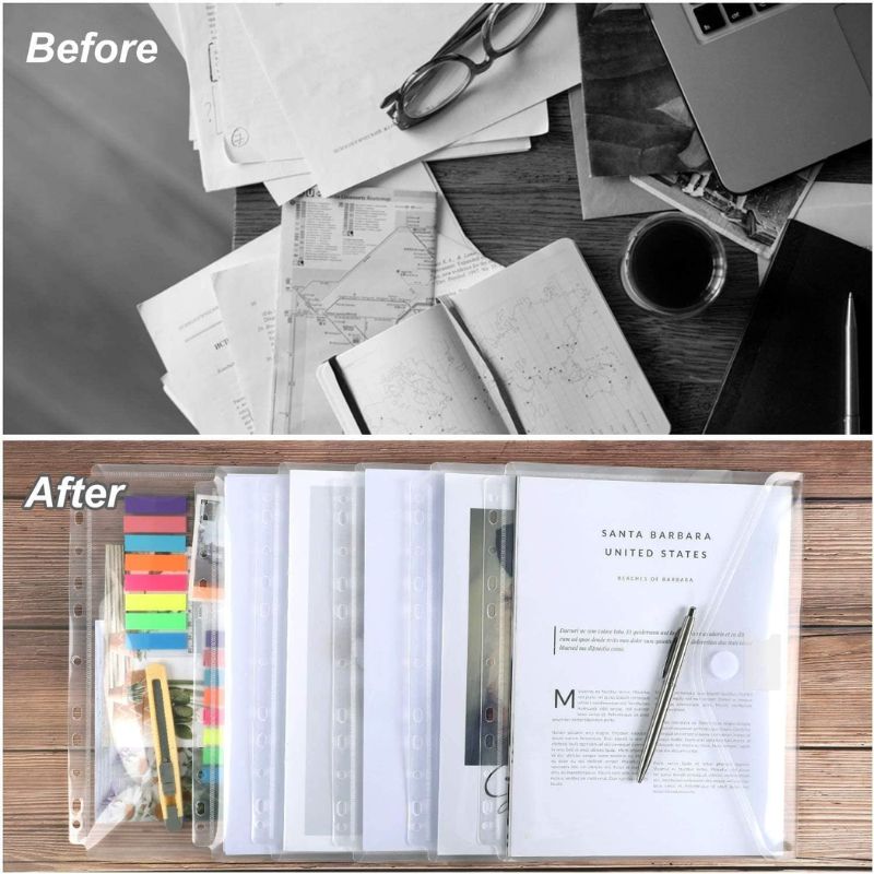 Na boční straně obalů na dokumenty se nachází 11 předem perforovaných děr, takže je lze vložit do pořadačů s 2, 3 nebo 4 kroužky, pořadačů nebo sborníků. To je zvláště užitečné pro organizaci školních předmětů, kancelářských projektů nebo ukládání bankovních a domácích dokumentů.