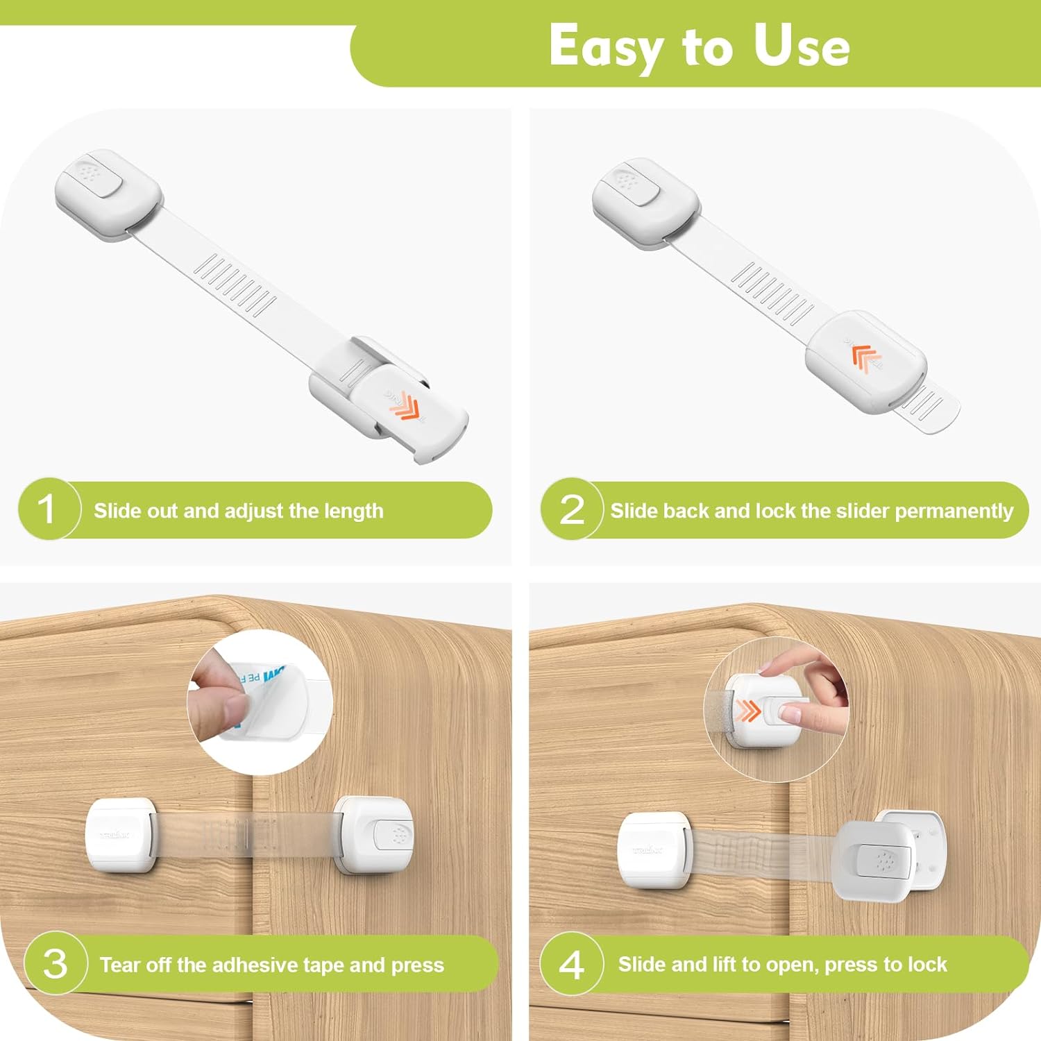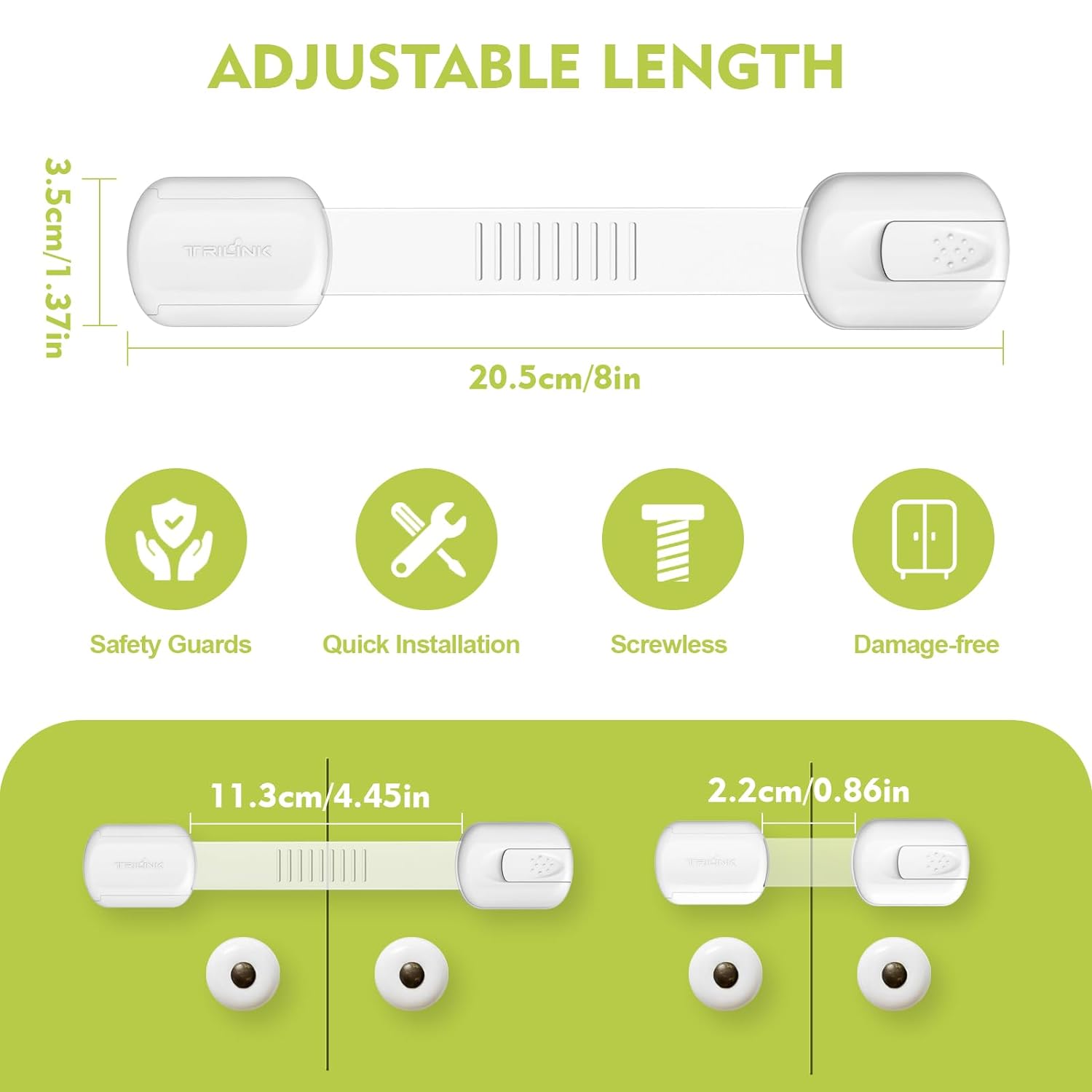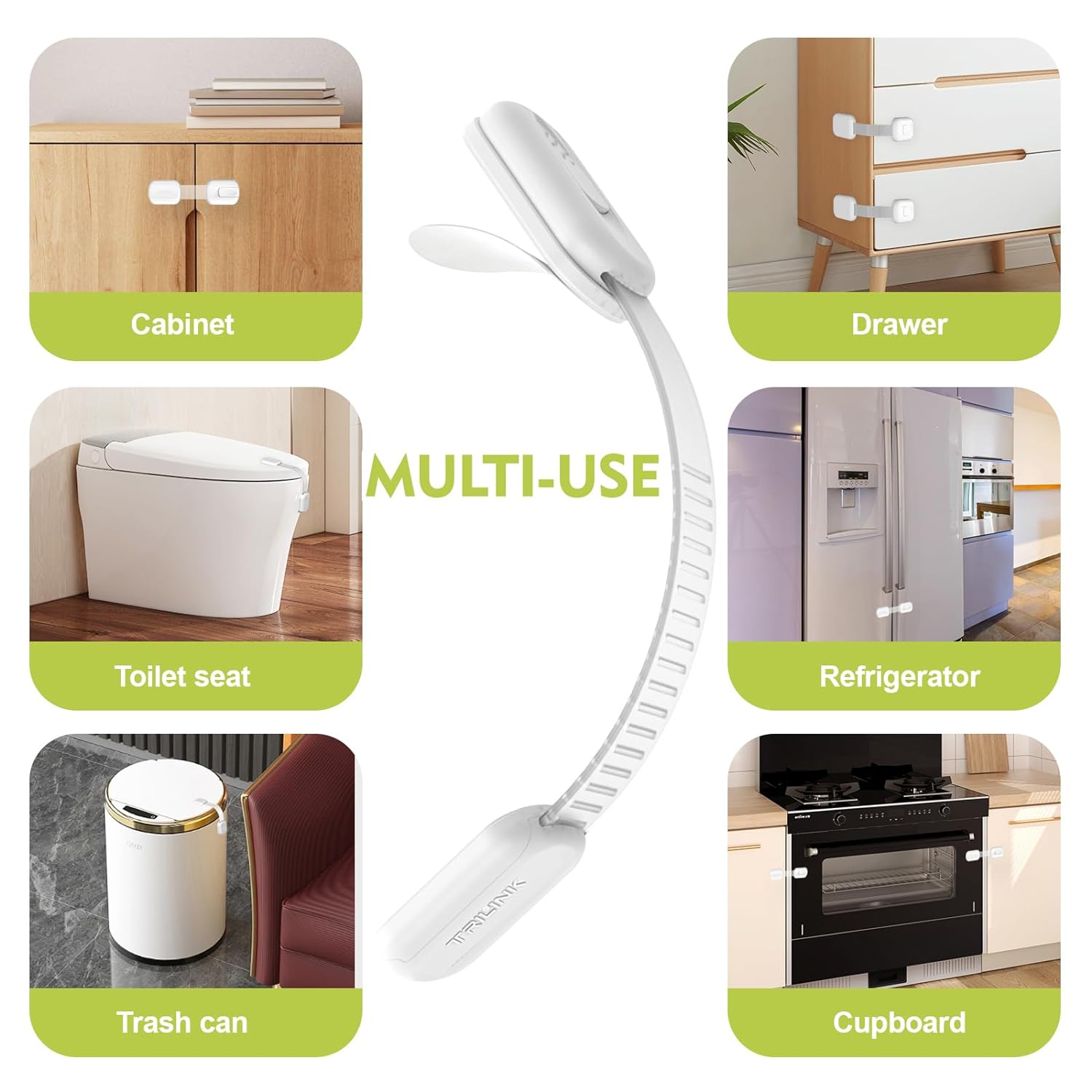 Nastavitelná délka pantů (mezi 11,5 cm a 20 cm) umožňuje použití na nábytku a zařízeních různých stylů a tvarů. Ideální řešení pro skříně, zásuvky, ledničky, WC sedátka, trouby, odpadkové koše a mnoho dalších zámků. Pomáhá držet děti dál od nežádoucích míst a zároveň zachovává bezpečnost vašeho domova.