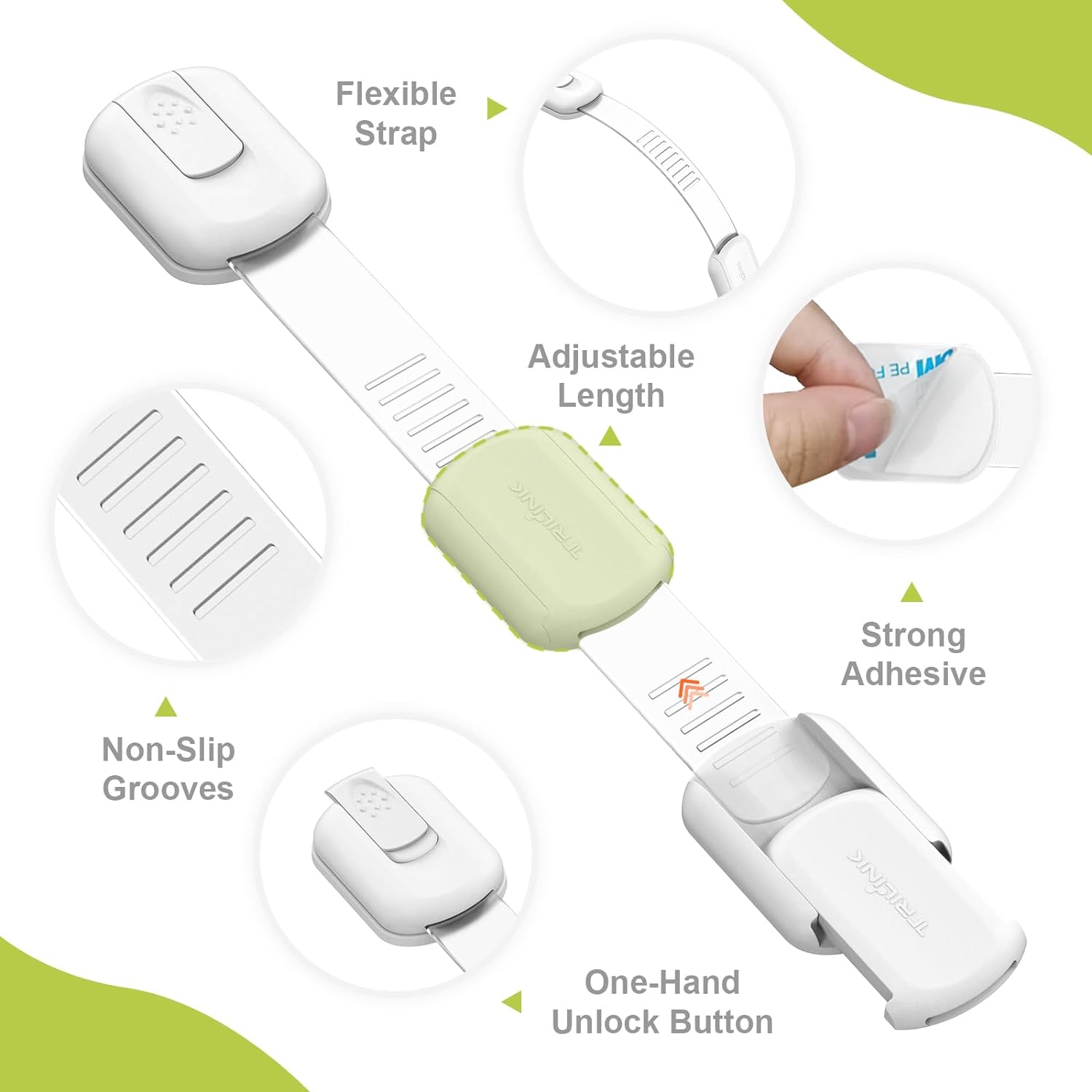 Dětské bezpečnostní pásové zámky jsou navrženy tak, aby předcházely nehodám, jako je přiskřípnutí prstů, přístup k nebezpečným předmětům nebo vyklízení skříní a zásuvek. Jejich použitím můžete udržet své dítě v bezpečí a zároveň ochránit pořádek ve svém domově.