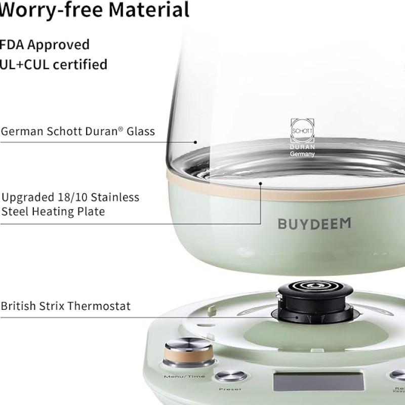 - Vynikající elektrická rychlovarná konvice: BUYDEEM K2763 Lite má 6 vestavěných přednastavených teplot vody, aby lépe připravila mléko, černý čaj, kávu, horkou vodu atd. Podporuje přednastavení a časovač, takže si můžete rychlovarnou konvici nastavit podle sebe.