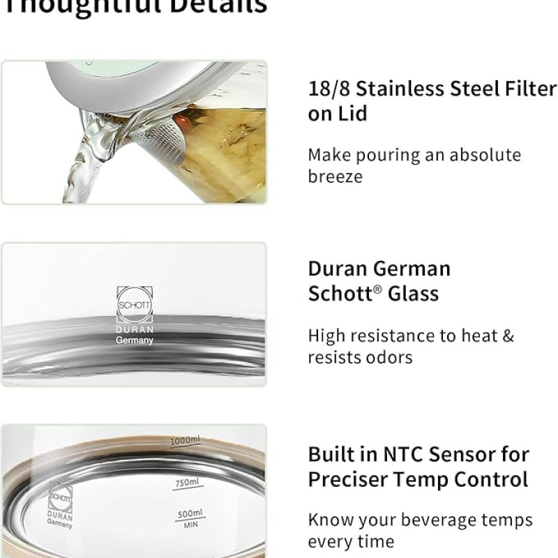 - Jemné detaily: Výlevka rychlovarné konvice má filtr pro snadné filtrování; varná nádoba je snadno skladovatelná se stojanem. Vynikající tichá technologie ji činí méně hlučnou.