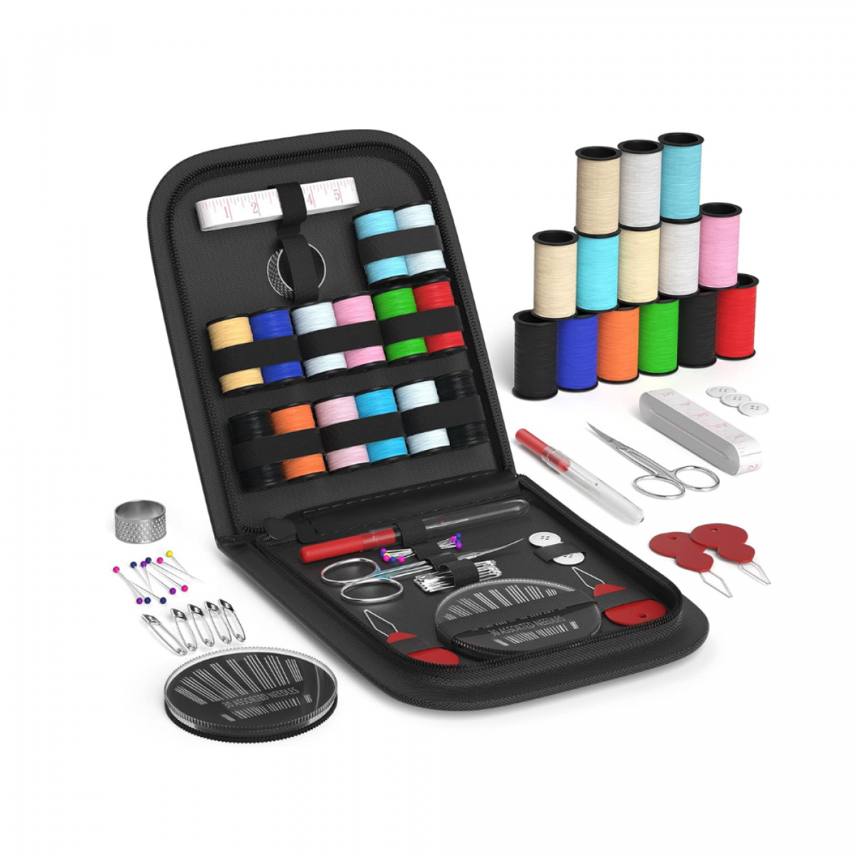 • Kompletní sada: Jehly, knoflíky, nůžky, náprstek, háčky, bezpečnostní špendlíky a mnoho dalších šicích nástrojů na jednom místě.