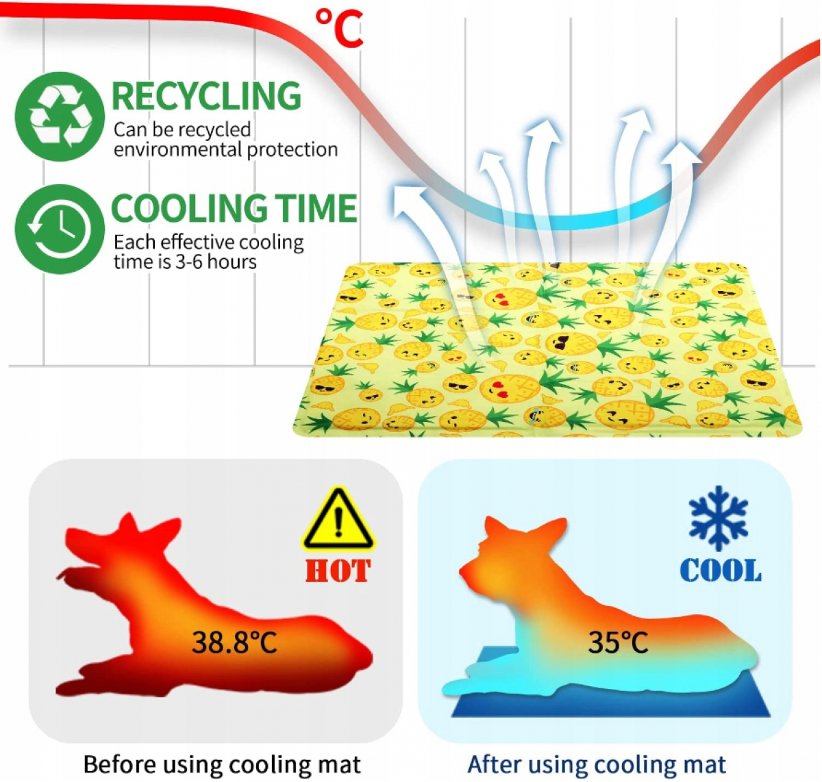 Naše chladicí podložka pro domácí mazlíčky osvěží vašeho psa, jakmile si váš čtyřnohý přítel lehne ke spánku. Při nepřetržitém používání chladí až 3 hodiny a po 15-20 minutách nepoužívání se automaticky ochladí.