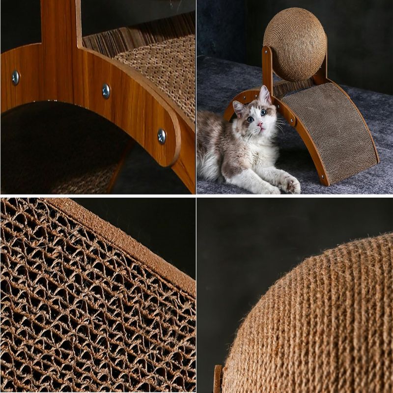 Design produktu umožňuje vaší kočce během hry otáčet míčkem, proplétat se zakřiveným tunelem nebo se pohodlně natáhnout. Dřevěná základna upevněná ve čtyřech bodech zaručuje stabilitu, takže se škrabadlo při používání nepřevrací. Snadno se sestavuje, přenáší a díky použití přírodních materiálů je také ekologické.