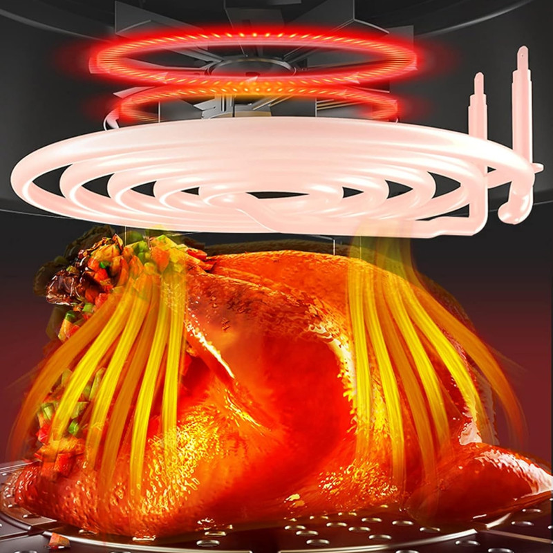 - Horkovzdušná technologie: Výkon 1500 W peče rychle a efektivně, přičemž minimalizuje použití oleje a výsledkem jsou zdravější pokrmy.
