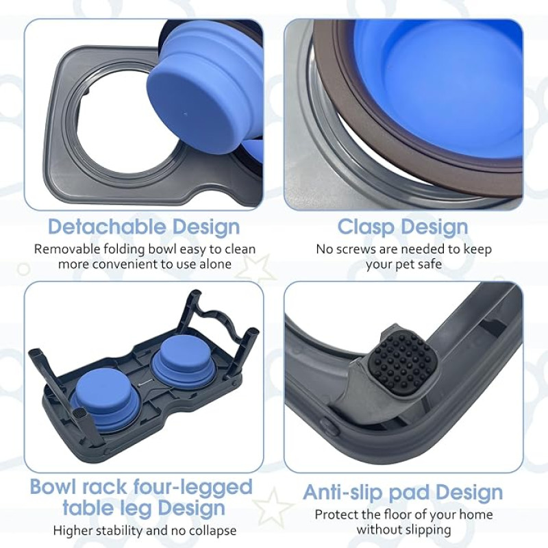 - Odnímatelné skládací misky se snadněji čistí a přenášejí, miska může být použita samostatně a je vhodnější na cesty. 2 skládací misky jsou vyrobeny z TPE, extra silné a odolné, ale nejsou vhodné pro sušení nebo horké topení.