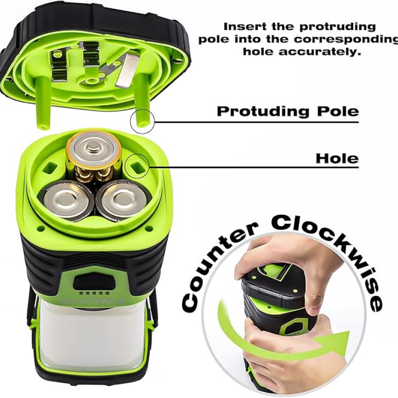 Baterka na kempování: Robustní, lehká a přenosná, ideální pro kempování, turistiku, rybaření, venčení psů a osvětlení stanů. 3 × D baterie (není součástí balení). Není třeba čekat na nabíjení. Když dojde energie, můžete baterii vždy vyměnit.