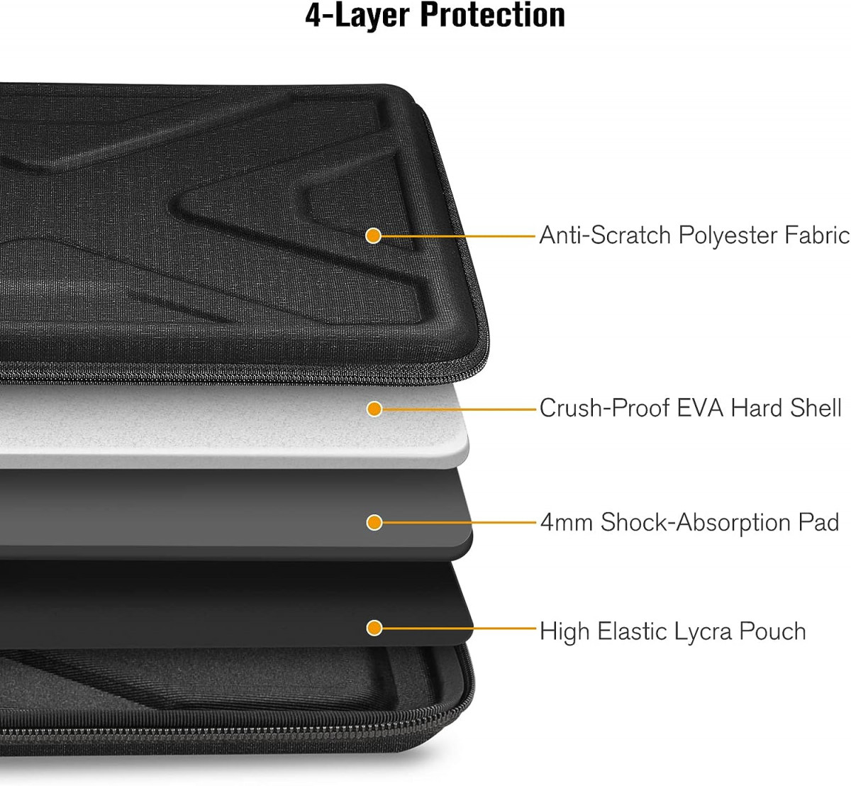 Odolný: S čtyřvrstvou nárazuvzdornou konstrukcí, polyesterovou tkaninou odolnou proti poškrábání, pevnou skořepinou EVA, která se nesmí stlačit, 4mm nárazovou podložkou a kapsou z vysoce elastického lycry, která vytváří pevné pouzdro na notebook.