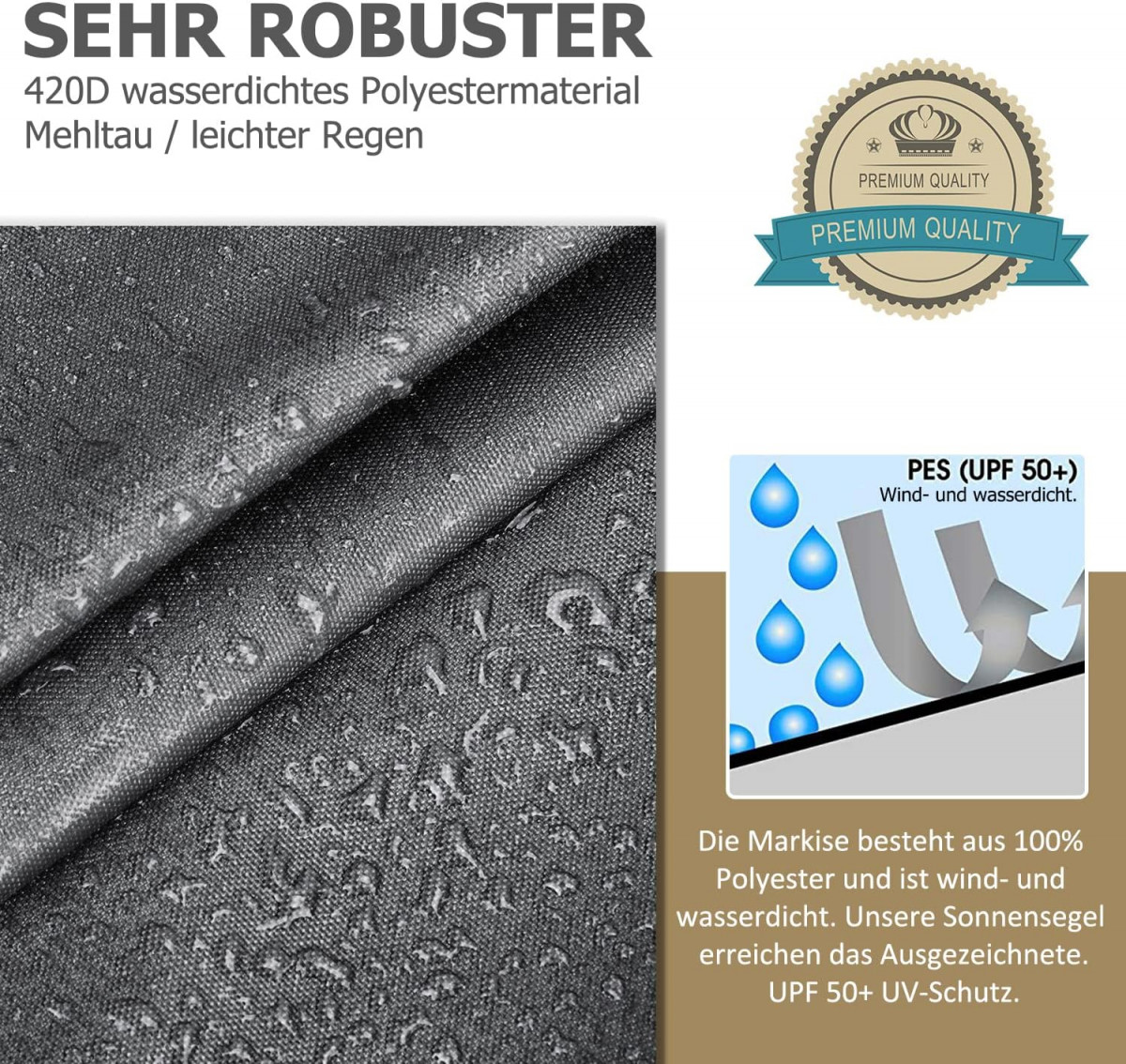 Vnější vrstva sluneční plachty je vyrobena z ekologické 420D polyesterové Oxford tkaniny, která je voděodolná, prodyšná a odpuzuje nečistoty. Díky tomu nejen chrání před deštěm, ale také dlouhodobě zachovává estetický vzhled.