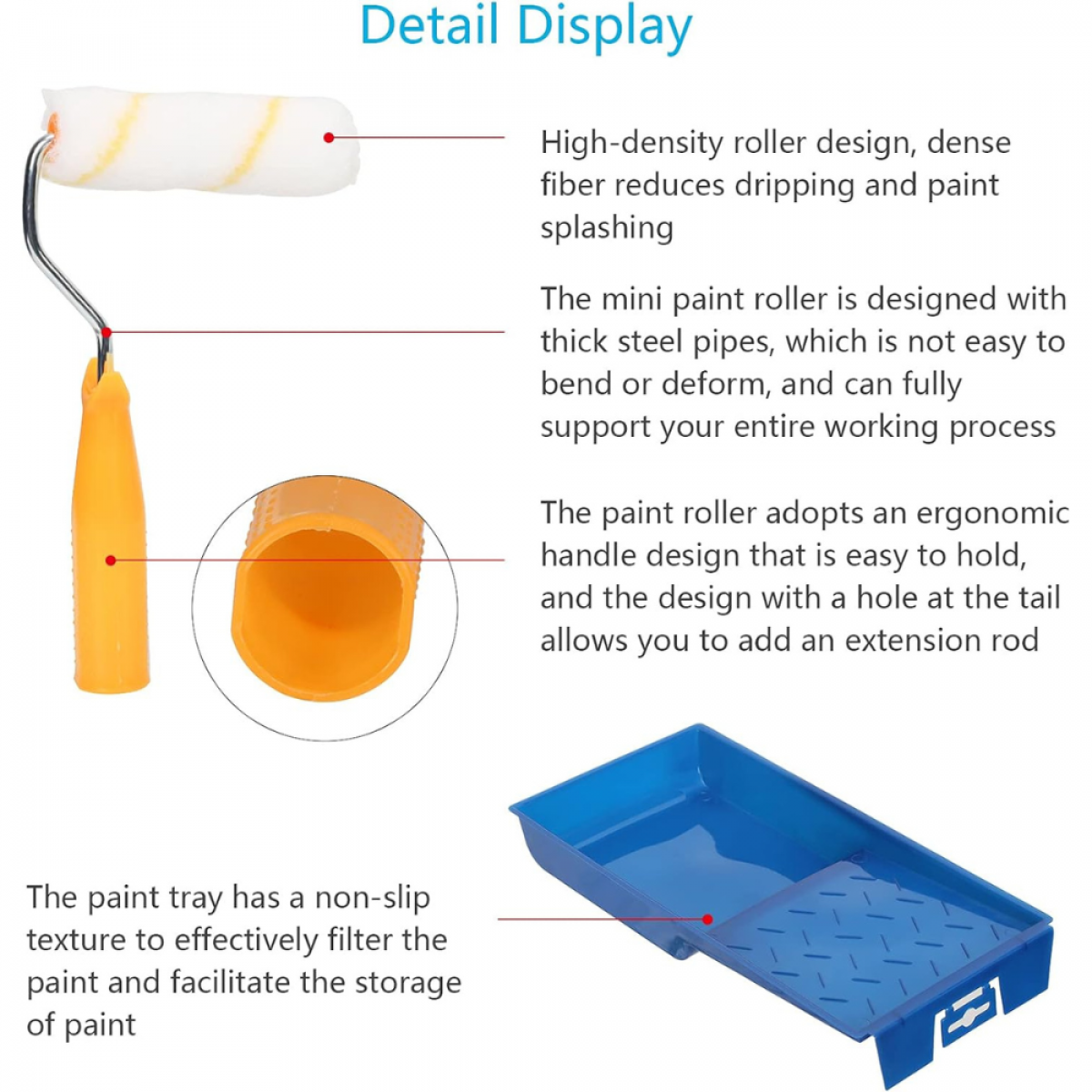 Sada mini válečků na malování o velikosti 4 palce (10 cm) je vynikající volbou pro malířské a dekorativní práce, ať už doma nebo v profesionálním prostředí. Válečky vyrobené z odolného a vysoce kvalitního vláknitého materiálu zajišťují dobrou schopnost nasáknutí barvy a rovnoměrný povrch, čímž snižují stříkání a tvorbu pruhů.