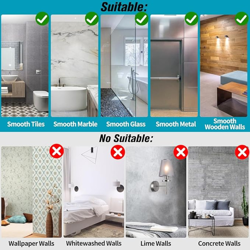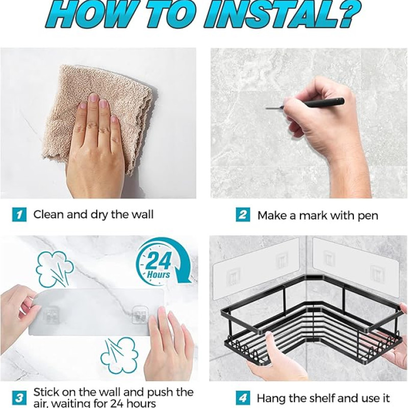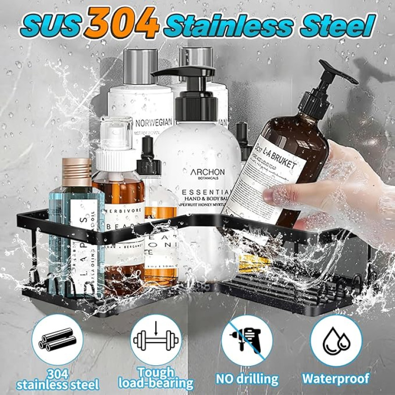 Díky vysoce kvalitnímu materiálu z nerezové oceli SUS 304 s tlustou, matnou povrchovou úpravou je police odolná proti korozi, rezivění a opotřebení, což ji činí vhodnou pro dlouhodobé používání. Inovativní design s řezanou linií zajišťuje správné větrání a rychlý odvod vlhkosti, aby police zůstala vždy čistá a svěží. Montáž bez vrtání umožňuje instalaci police na zeď bez poškození: jednoduše přilepte lepicí pásku a počkejte 24 hodin před použitím.