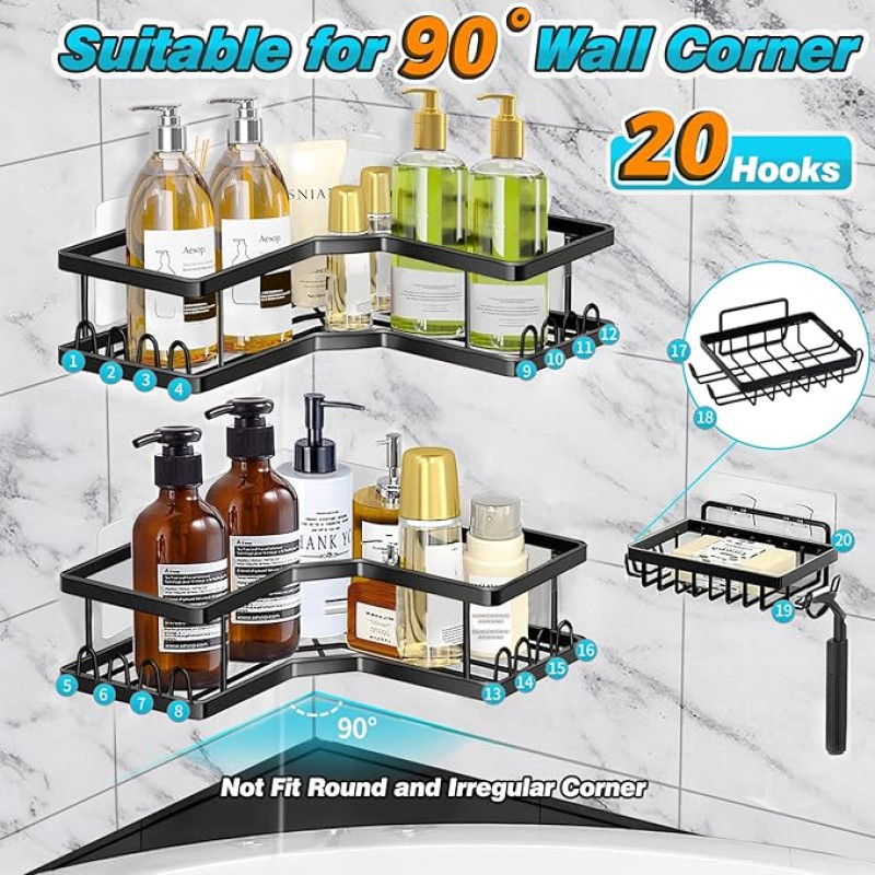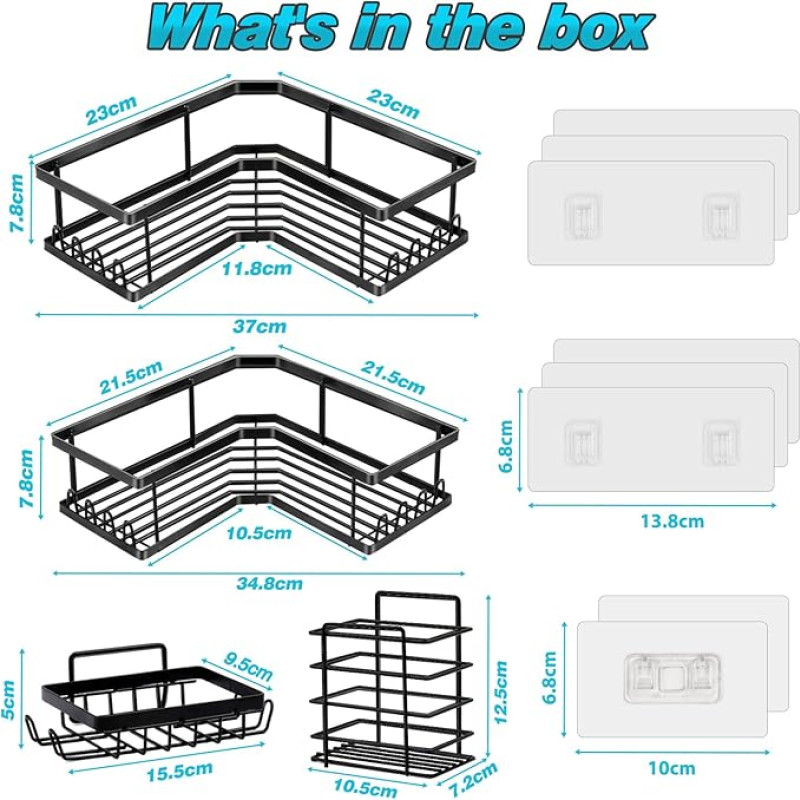 Sada 4 kusů sprchových polic Wilkpow bez vrtání – praktické, moderní a odolné řešení úložného prostoru do koupelen. Tato sada obsahuje 2 sprchové police, 1 držák na mýdlo, 1 držák na zubní kartáček a 8 lepicích pásek, které umožňují jednoduché upevnění na zeď. Velká sprchová police poskytuje dostatek místa na šampony, kondicionéry, mýdla a další koupelnové doplňky, zatímco prakticky navržených 8 mini háčků umožňuje zavěšení houbiček nebo menších ručníků.