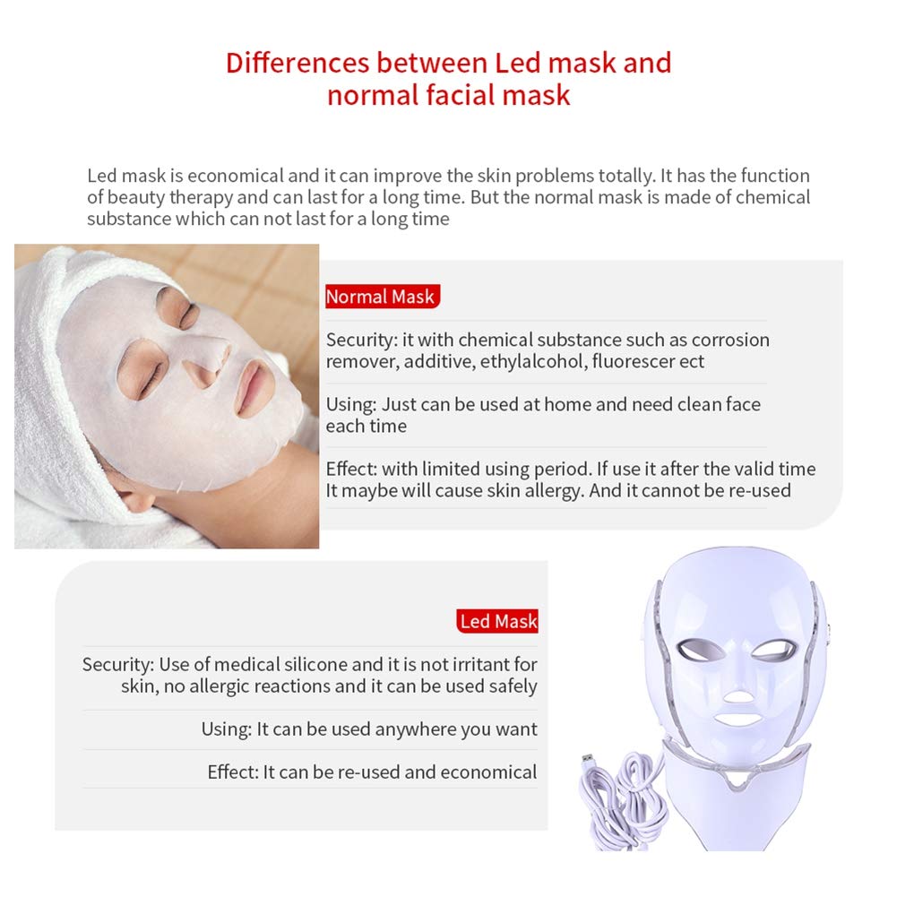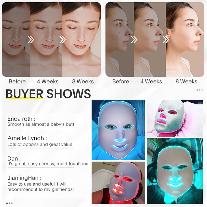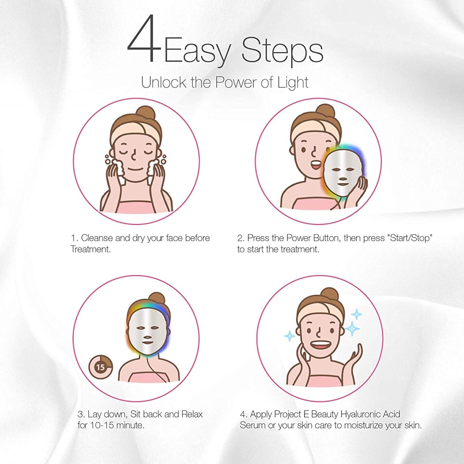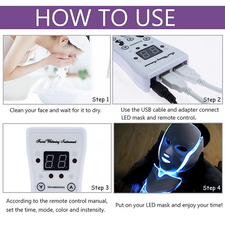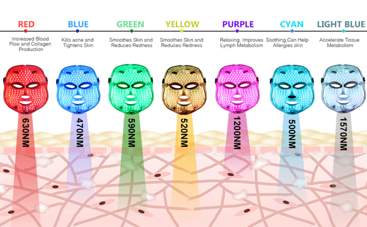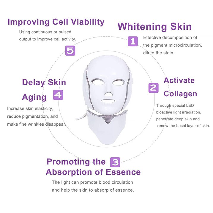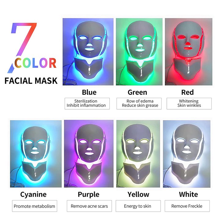 A maszk 7 színű fénymódot kínál: a vörös fény serkenti a kollagéntermelést és feszesíti a bőrt, a kék fény nyugtatja és tisztítja a pattanásos bőrt, a zöld fény segít a pigmentfoltok halványításában, a sárga fény csökkenti a bőrpírt, a lila fény javítja a nyirokkeringést, a cián fény nyugtató hatású, a fehér fény pedig gyorsítja az anyagcserét és támogatja a bőr regenerációját.