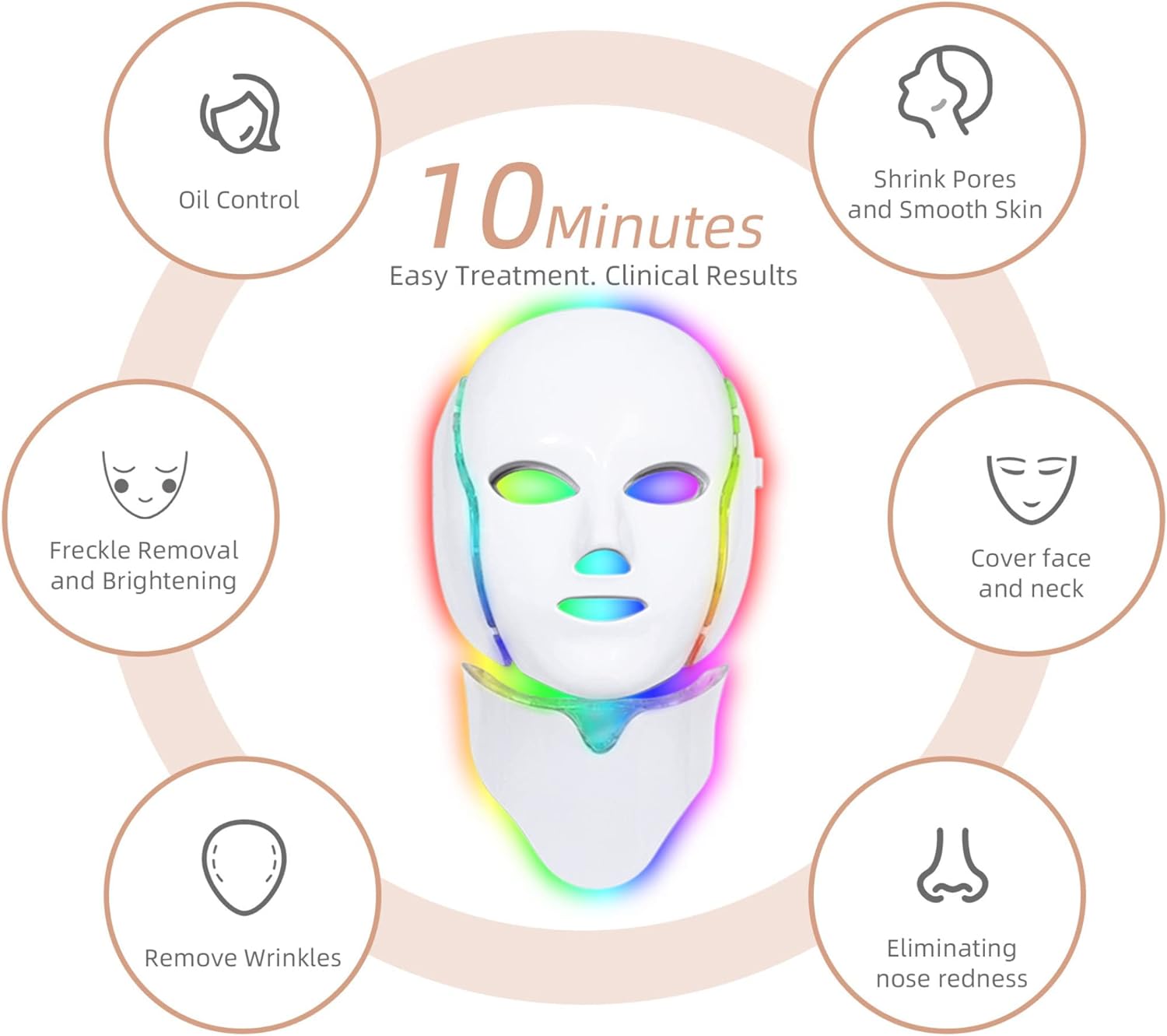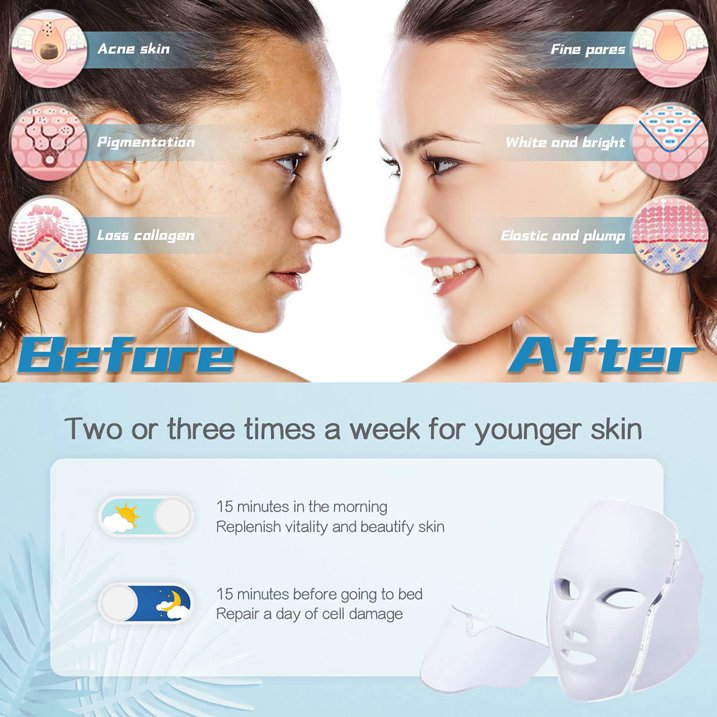 A 7 színű LED arc- és nyakmaszk professzionális szintű fényterápiás kezelésre ad lehetőséget, amelyet eddig csak szépségszalonokban lehetett igénybe venni. Több mint 192 LED-lámpagyönggyel működik, amelyek különböző hullámhosszú fényekkel segítenek a bőr megújításában, regenerálásában és fiatalításában. Az eszköz természetes fényhullámokat bocsát ki, amelyek mélyen a bőr rétegeibe hatolnak, serkentve a kollagéntermelést, javítva a vérkeringést és támogatva a bőr természetes helyreállító folyamatait.