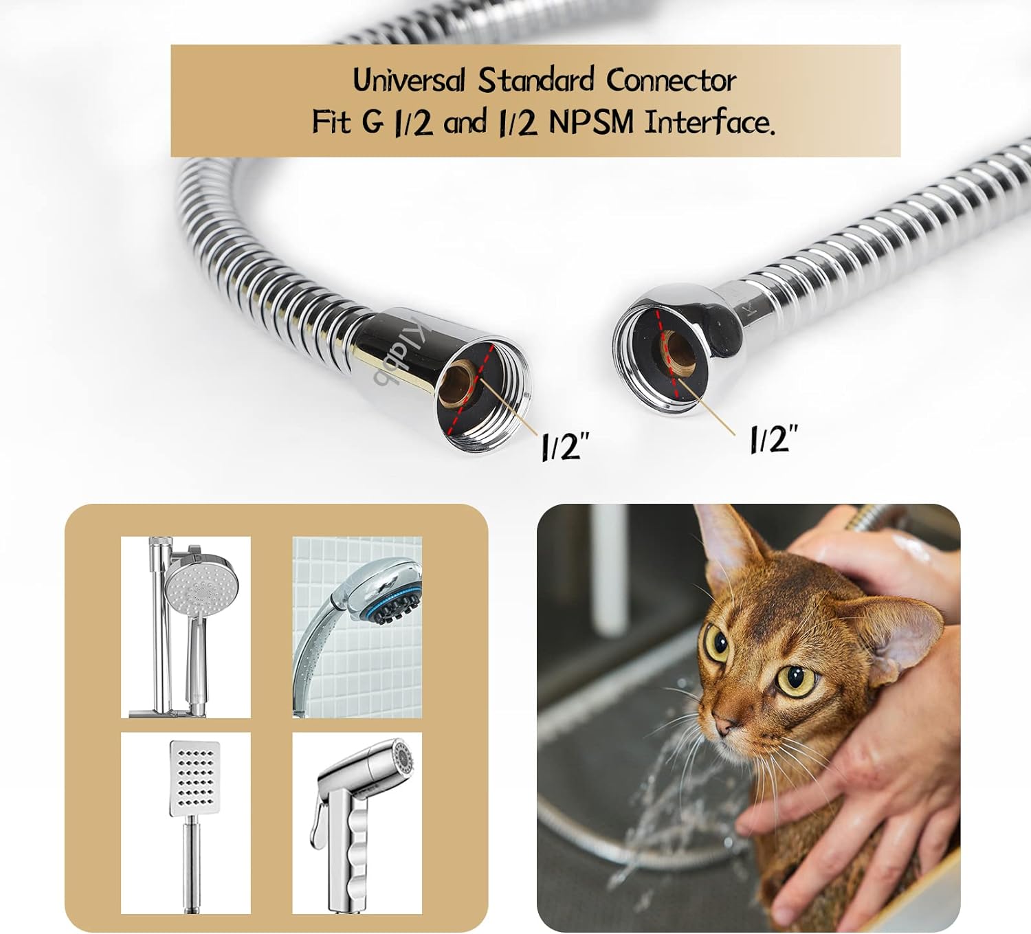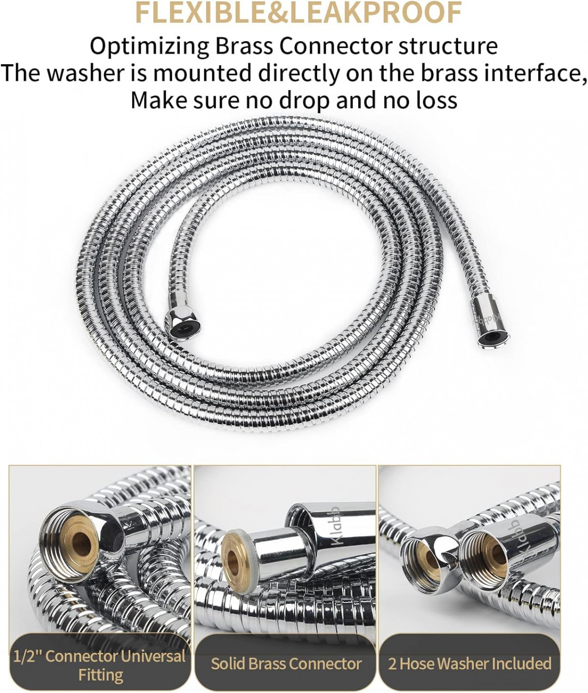 Przewód prysznicowy jest wyposażony w mosiężne złącza oraz cztery uszczelki bezpieczeństwa, które gwarantują szczelne połączenia. Dzięki standardowemu rozmiarowi złącza G1/2 można go łatwo dopasować do każdej głowicy prysznicowej lub baterii, nawet bez użycia narzędzi.